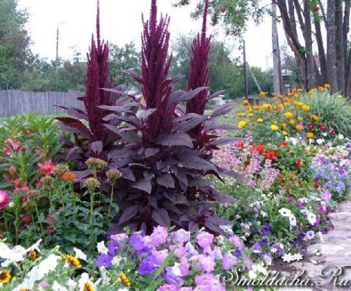 Хорош амарант и на клумбе. Можно подсадить великан амарант на задний план цветника. Красивые красноватые листья будут замечательно оттенять другие цветы.