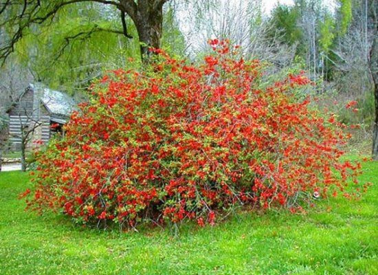 А вот кусты айвы внимание привлекают ранней весной. Цветет айва до роспуска листьев. Все побеги ее усыпаны крупными, похожими по размеру и форме на яблоневые, яркими карминно-красными цветами.