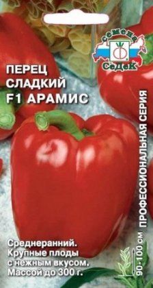 Арамис F1 — Гибрид рекомендуется для использования в свежем виде, домашней кулинарии и для консервирования. Растение полураскидистое, высотой 70 см. На одном растении одновременно формируется до 12 плодов. Плод пониклый, призмовидной формы, ребристый, сильноглянцевый, окраска в технической спелости светло-зеленая, в биологической — темно-красная. Масса плода 230 г, толщина стенки 8 мм, вкус отличный. Урожайность товарных плодов 7,8 кг/кв.м.