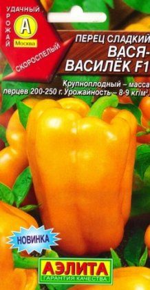 Вася Василек F1 — Растение полураскидистое, высокое. Плод призмовидный, сильноглянцевый, окраска в технической спелости зеленая, в биологической — темно-желтая. Масса плода — 190-245 г, толщина стенки — 8 мм. Вкус свежих плодов отличный. Урожайность товарных плодов под пленочными укрытиями — 8.3 кг/кв.м.
