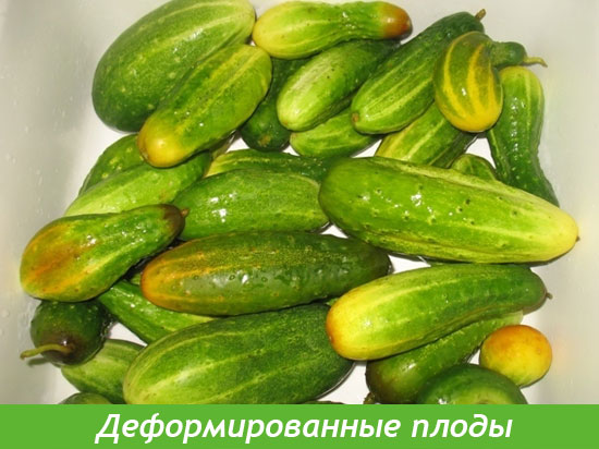 Искривление плодов огурца — огурчики крючком, вздутие на конце плода, и другие деформации могут возникнуть от несбалансированности микроэлементов в почве. Это связано как с несоблюдением севооборота (выращивание огурцов несколько лет подряд на одном месте), так и с большим выносом питательных веществ из почвы растением (кривые огурчики дачники замечают в конце сезона).