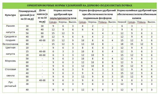 Нормы внесения различных удобрений под овощные культуры зависят от вида и уровня плодородия почвы, величины урожая, биологических особенностей культур, сортов и так далее. Под раннюю капусту на дерново-подзолистых почвах вносят 4-6 кг органических удобрений в сочетании с 6-9 г/кв.м азотных, 6-9 фосфорных и 9-12 г/кв.м калийных удобрений. Эти удобрения (кроме азотных) целесообразно вносить осенью под запашку или перекопку, потому что капусту высаживают рано.