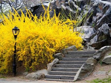 Представьте себе свой участок еще до распускания листвы, когда трава как следует не зазеленела. Пусть среди черной земли и прошлогодних листьев уже раскрылись примулы, крокусы, подснежники, но их робкие нежные краски не снимут ощущения голого сада, если им в помощь не забьет навстречу солнцу золотой фонтан форзиции.