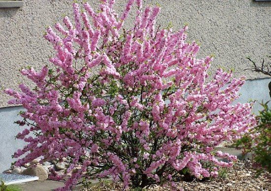 Любителям каменистых горок, композиций с валунами рекомендую для весеннего эффекта миндаль низкий (степной), или бобовник. Изящный прямостоячий кустик высотой всего около 1 м раскрывает бутоны очень рано (в Москве в середине мая), одновременно с распусканием листьев. В течение 10-15 дней в зависимости от зоны тонкие веточки бывают усыпаны сверху донизу нежными розовыми цветками.