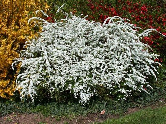 С. острозазубренная, или с. аргута, высотой 1,5-2 м, зацветает раньше, с распусканием листьев (в Москве — в середине мая). Ее зонтики настолько обильно покрывают длинные тонкие побеги, что под этой благодатной ношей они принимают изящные изгибы. Если весна не очень бурная, декоративный эффект длится до 17 дней. В такое время куст очень красив сам по себе и рядом с алыми, малиновыми, «черными» тюльпанами.