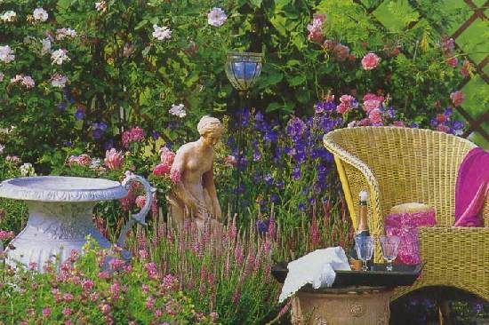 Оформление сада в романтическом стиле строится в большей мере на интуиции, нежели на каких-либо законах дизайна. Любая, даже самая незначительная деталь может дать толчок безудержной фантазии.